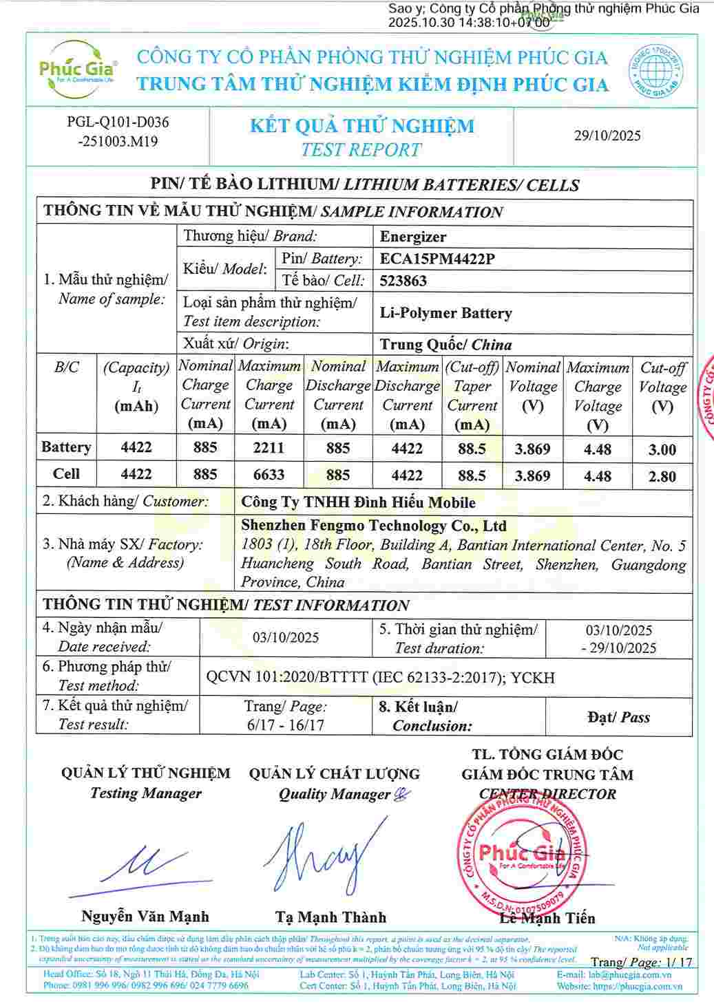 Xem thêm giấy tờ kiểm định full Pin Energizer iPhone 15, 15 Plus, 15 Pro, 15 Pro Max tại đây