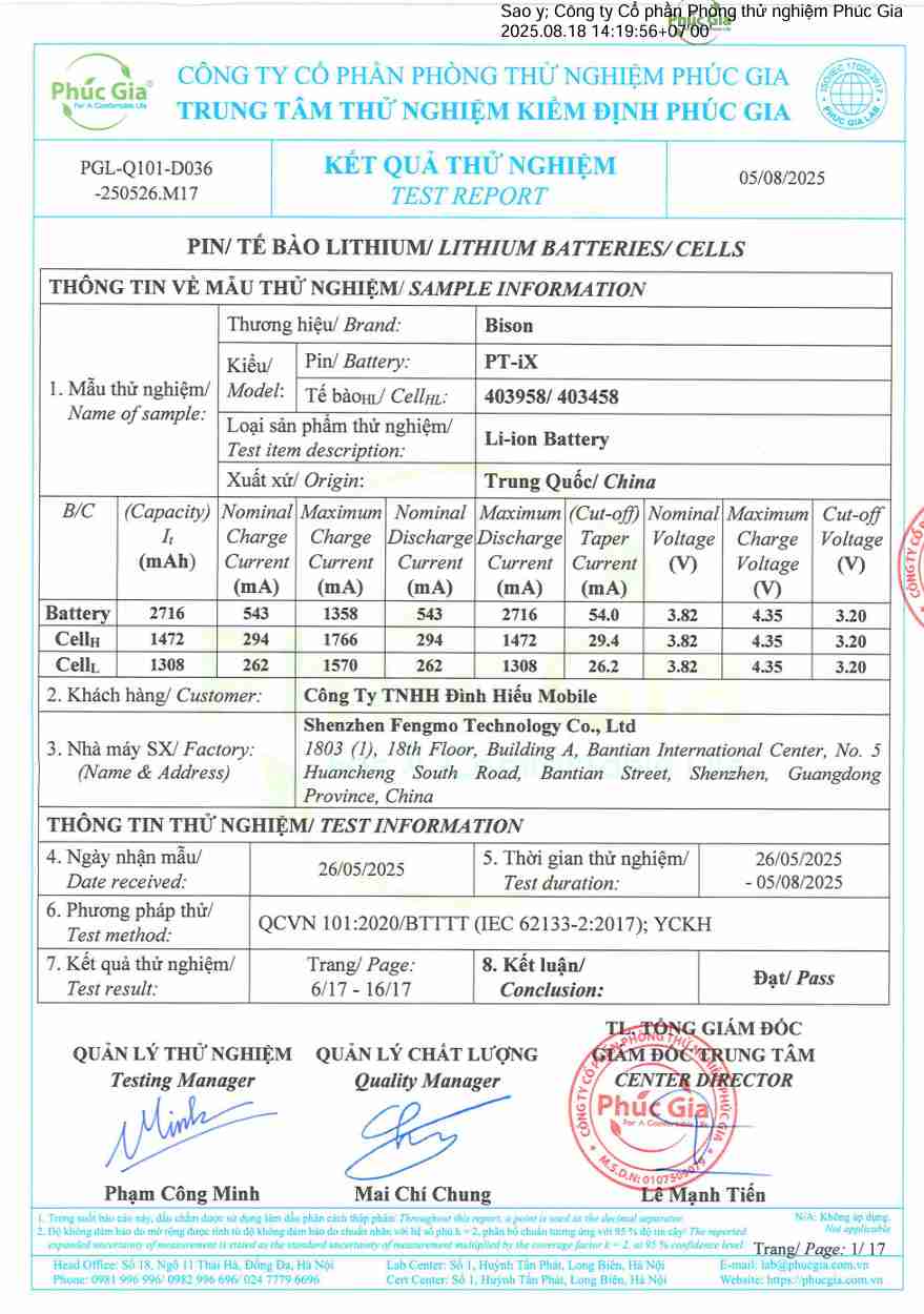 Kết quả kiểm định Pin Bison iPhone X tiêu chuẩn
