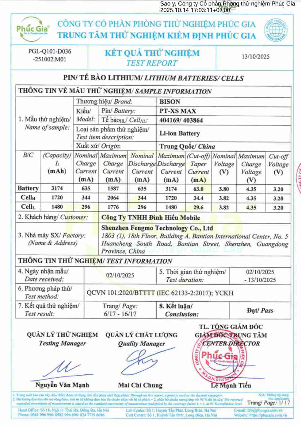 Xem thêm giấy tờ kiểm định full của Pin Bison iPhone X, Xr, XS, XS Max tại đây