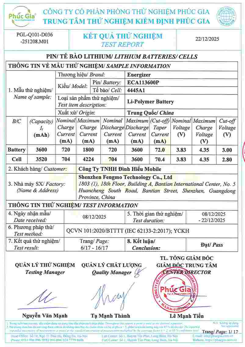 • Giấy tờ kiểm định Pin Energizer Ultimate Replacement Mobile Battery đạt tiêu chuẩn Việt Nam xem thêm bản full PDF toàn bộ tại đây